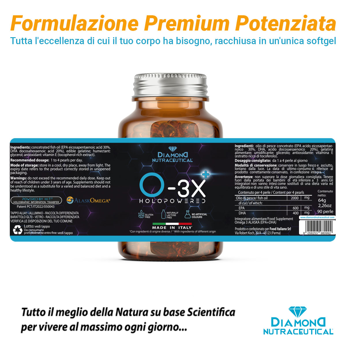 A base di olio di pesce selvaggio proveniente dai mari di Berin (Alaska) concentrato in EPA e DHA. O-3X rappresenta la fonte più pura e potente di acidi grassi Omega-3 in forma di trigliceridi maggiormente assimilabili dall’organismo. A differenza di tutti gli altri integratori di Omega-3 con capsule enormi e difficili da deglutire, O-3X Omega 3 Alaska è formulato in perle softgel di dimensioni ridotte e facili da assumere.