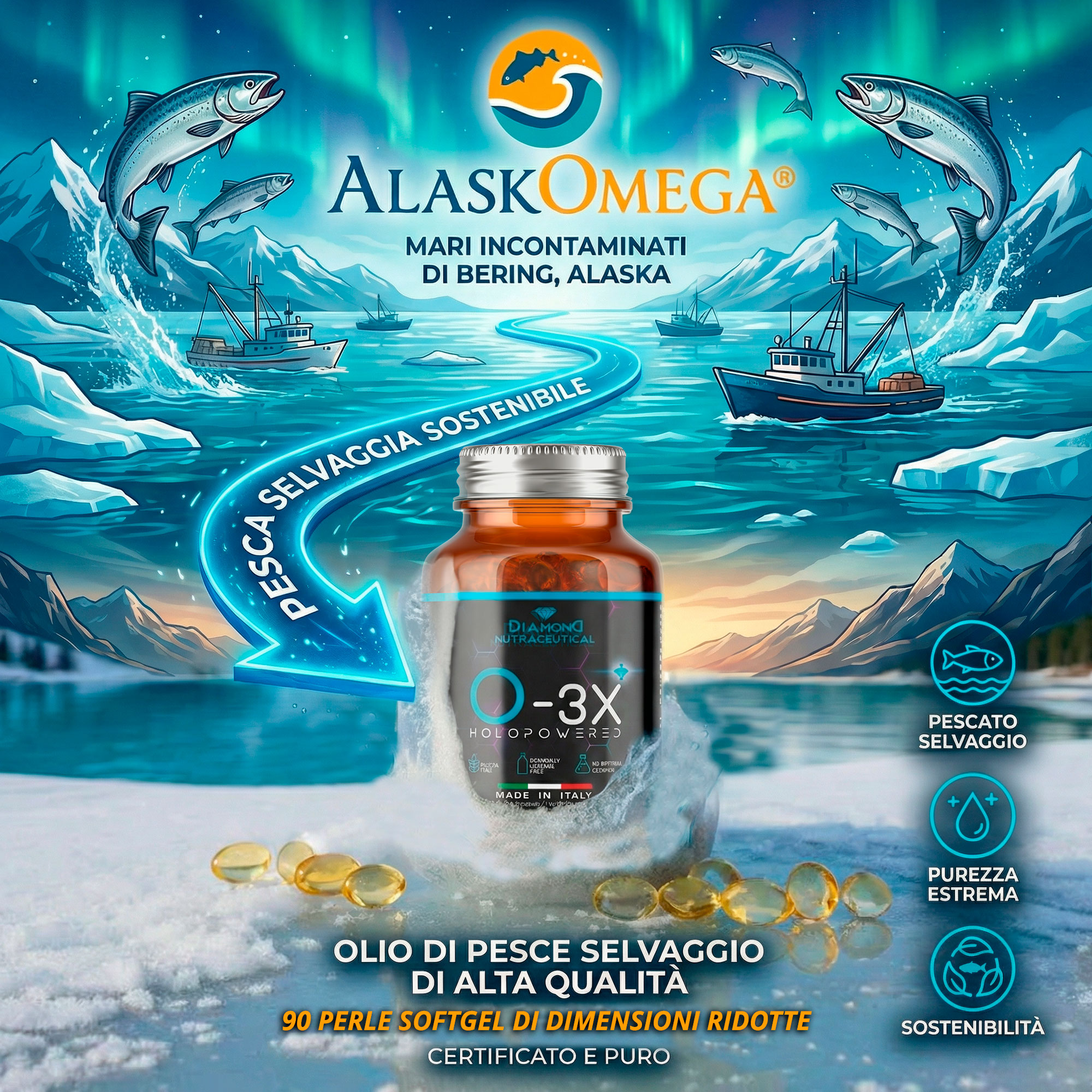 O-3X BIOPOWERED | Omega 3 Alaska Potenziati con Olio di Pesce Puro a Distillazione Molecolare Senza Metalli Pesanti