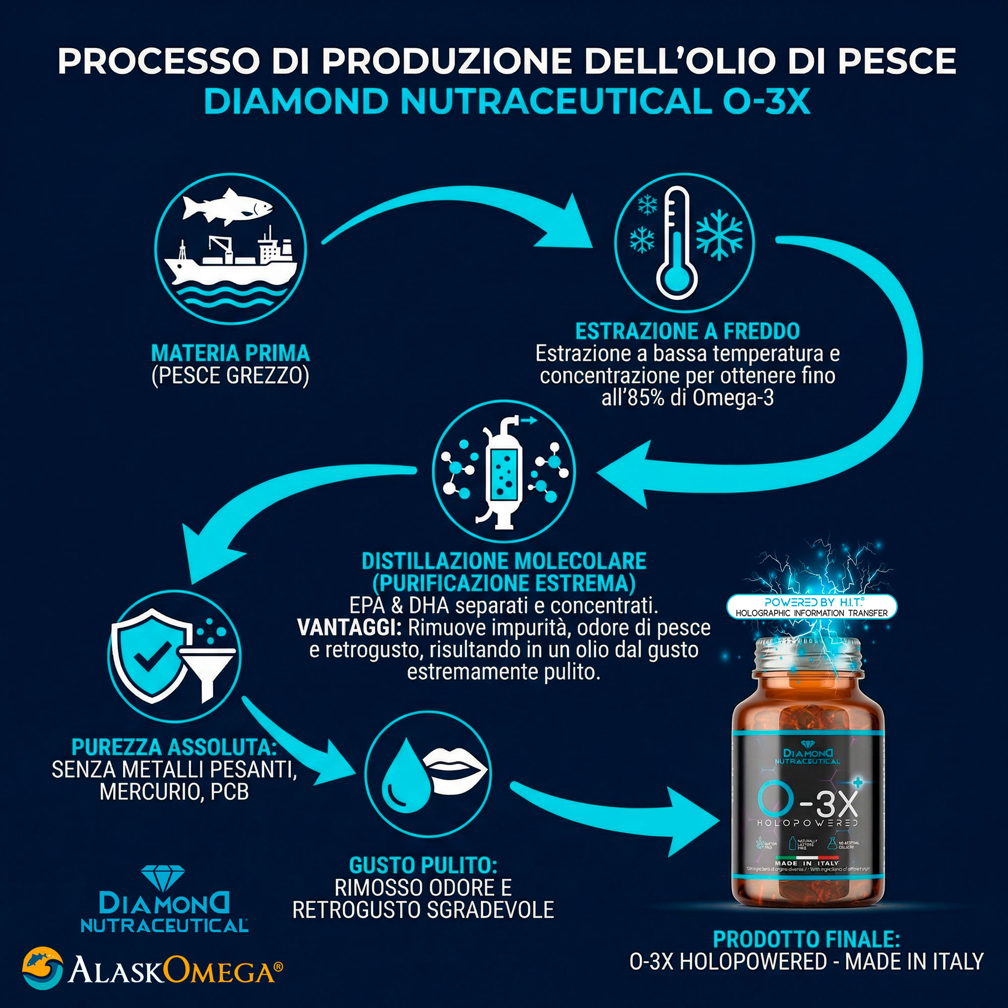 Brevetto internazionale ALASK OMEGA che certifica la provenienza dell’olio di pesce solo ed esclusivamente da merluzzi (pollock) pescati nel mare dell’Alaska, il mare più pulito del nostro globo.